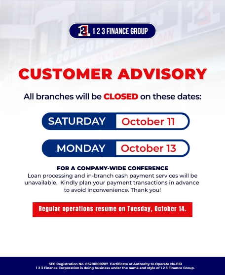 We offer various payment solutions to help you get back on track with your financial obligations, subject to our terms and conditions. All you need to do is email us at collection@123finance.ph or call our Collection Department during working hours (PH time).